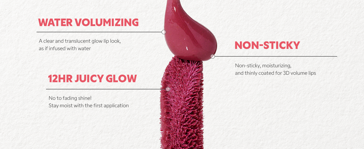 ·[PLUMPING GLOW FINISH] Formulated with glycerin and hydrating ingredients, this gloss delivers a crystal-clear, plumping shine with a water glow effect that enhances natural lip volume without irritation. The lightweight texture glides effortlessly, creating a juicy, radiant finish.